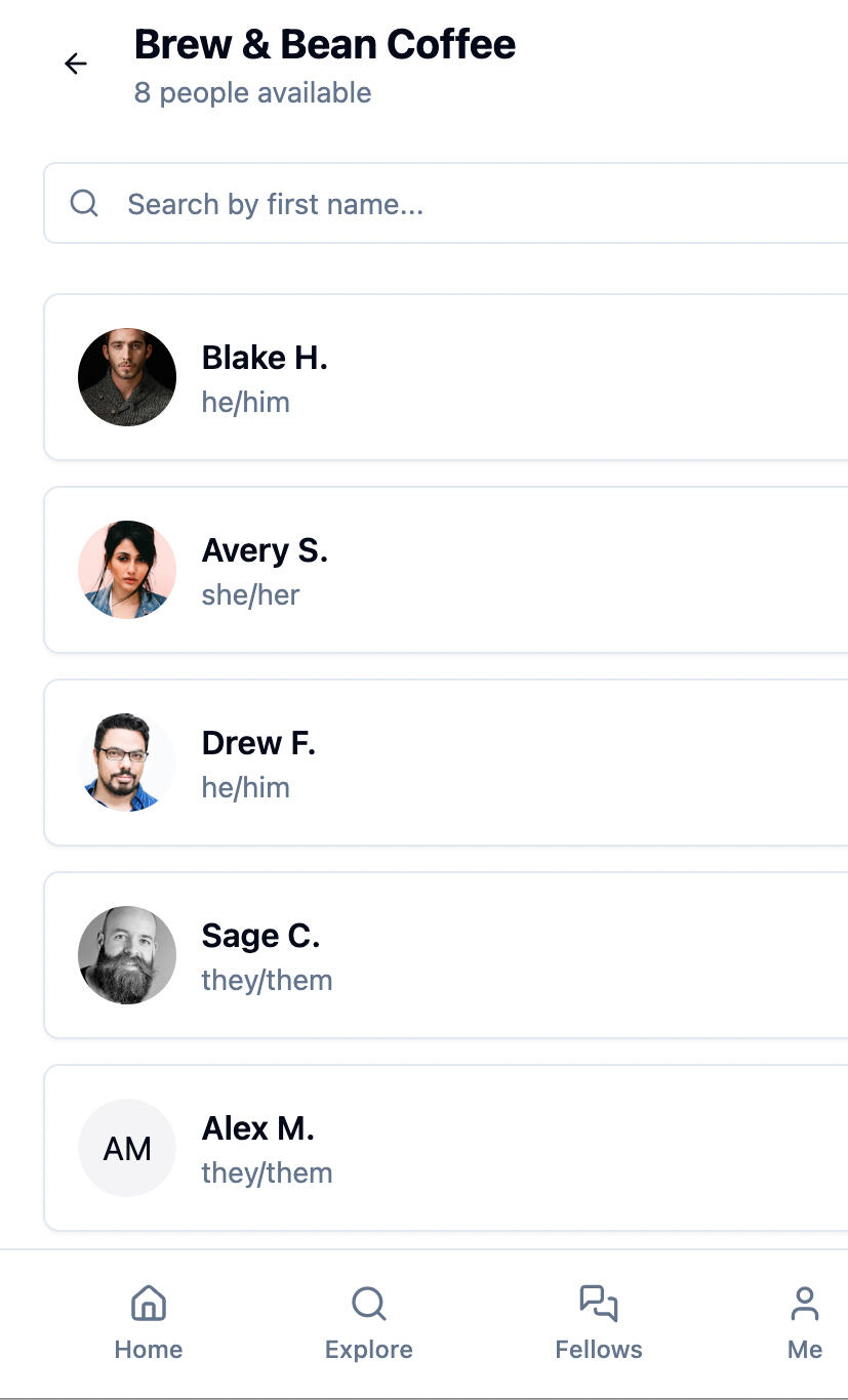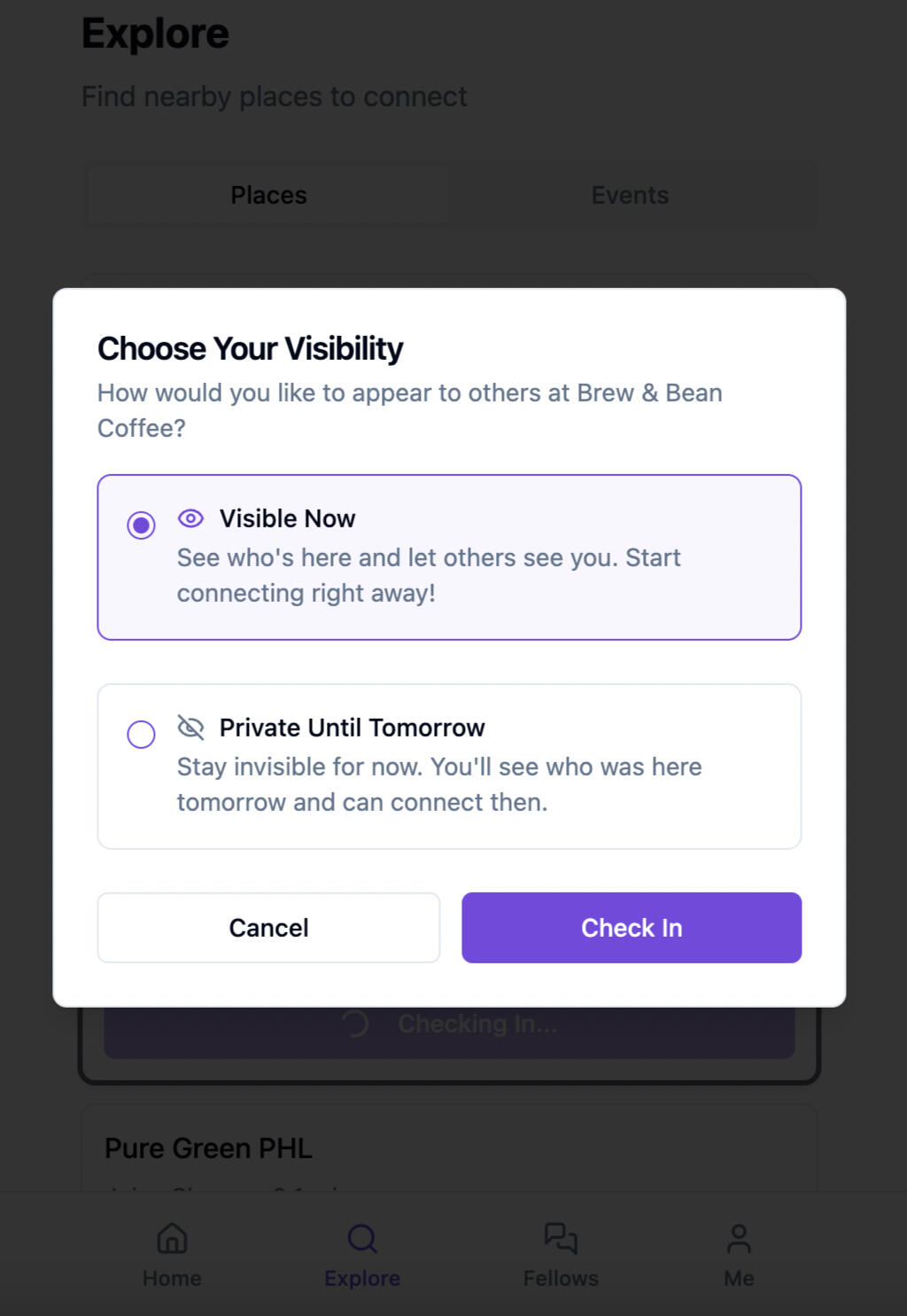 In the mood to connect? Show up to your favorite coffee shop, juice bar, workout class, meetup – wherever – and check in on the Fellow app. Choose to be visible now or later. It's up to you.