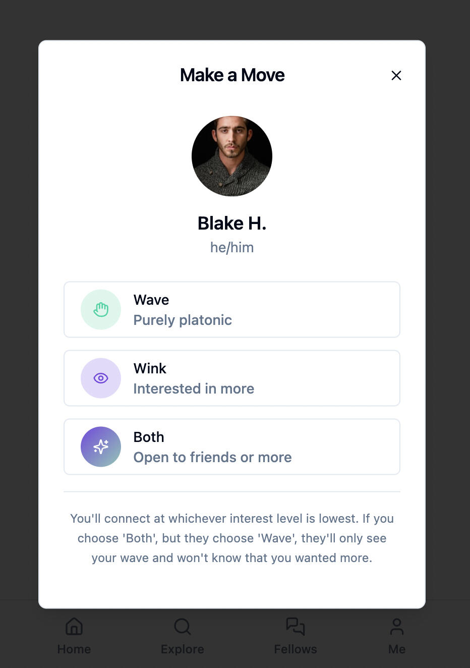There's nothing to lose.Choose to Wave (platonic hello), Wink (interested in more), or send Both (open to friends or more). You'll connect at whichever shared interest level is lowest.So, if you choose 'Both', but they choose 'Wave', they'll only see your wave – and your romantic interest remains a secret.Notifications are never sent unless a connection is made.